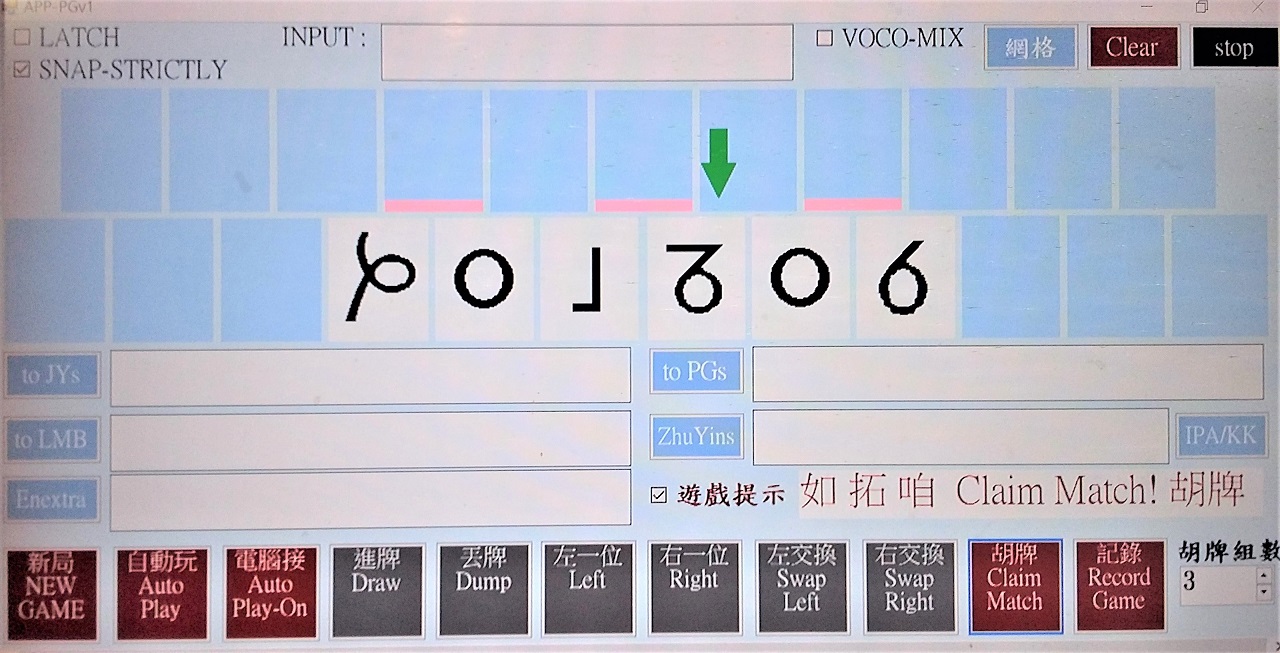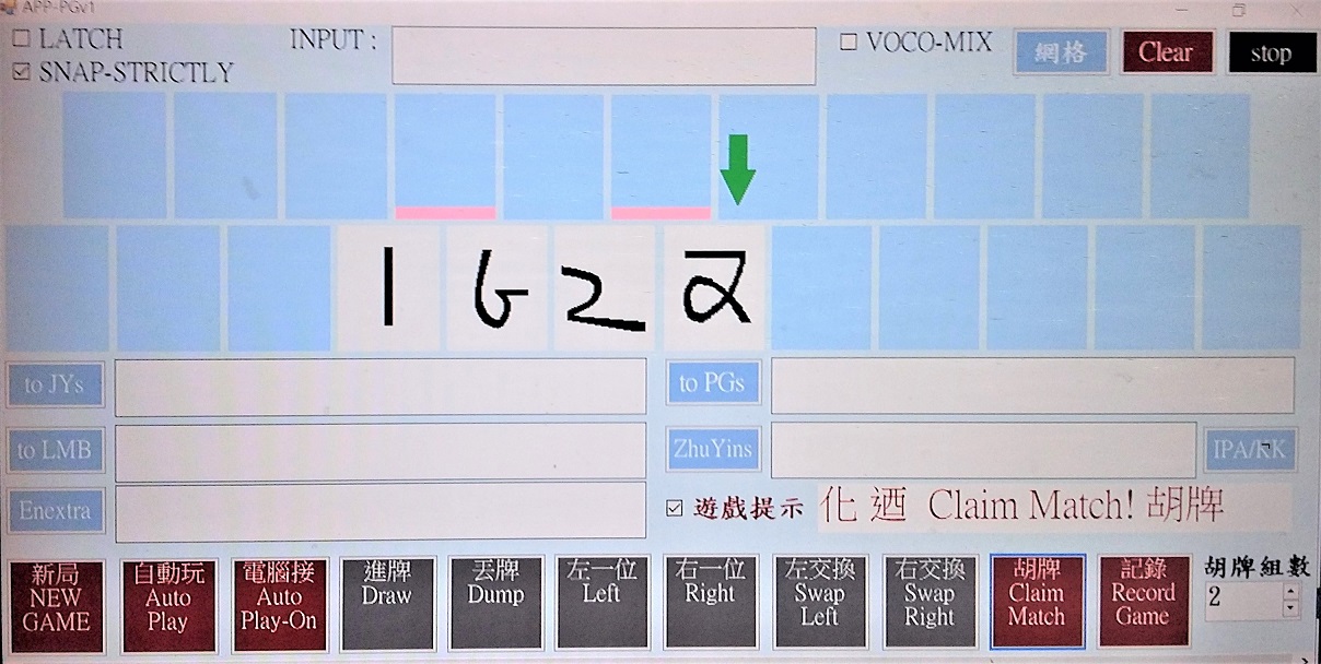 咱先說明遊戲功能。下圖展示了一種遊戲結果,其被完全地分組 到 兩個初調字料 在 第一候選表,所以遊戲提示攔位標示"胡牌"。