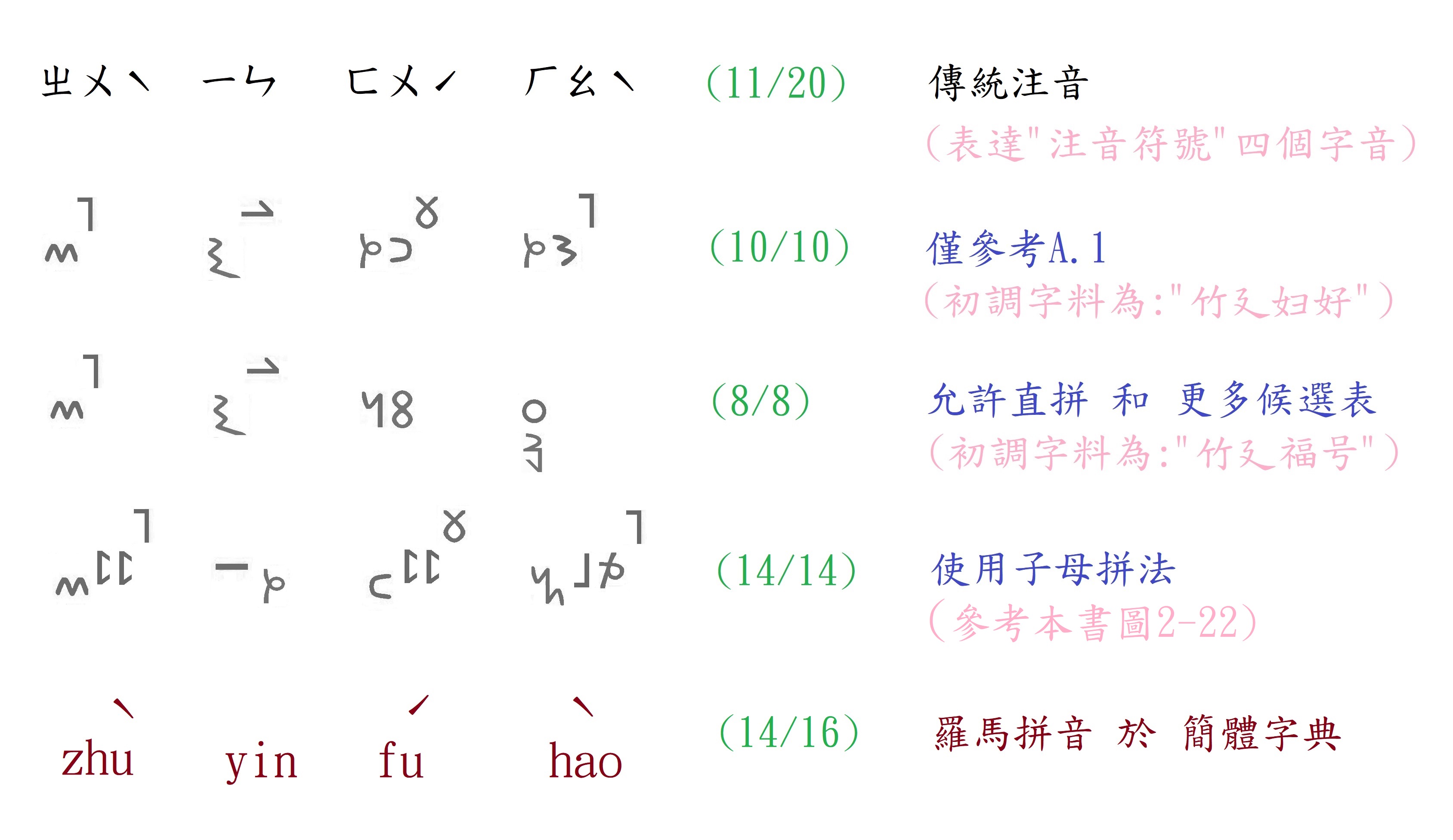 双拼轉調法 和 其衍生的 子母拼法能更優 較於 注音 和 羅馬拼音 針對 國字音標這一領域。下圖說明了這一點。