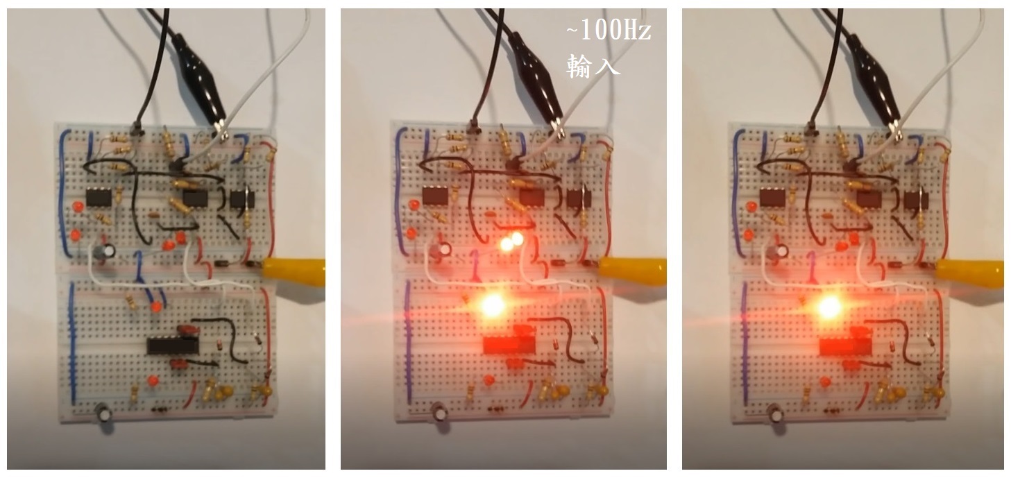 實際實驗時,咱用筆電去產生11150Hz 或 150Hz 給 同一個耳機孔通道,然後用上圖的 電路板 去 區分來音是高頻 或 低頻 在 耳機孔。