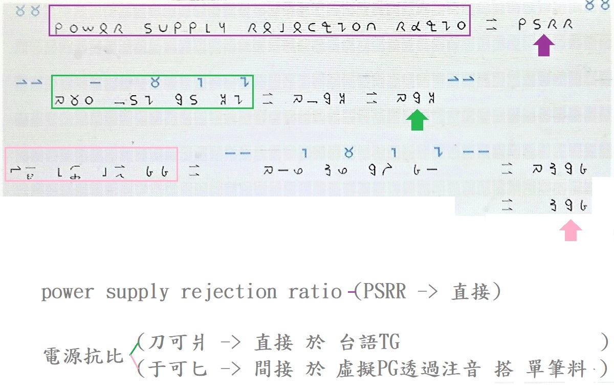 比如,下圖的 紫色框 和 紫色箭頭用英文 去 說 power supply rejection ratio 對應到 PSRR,台語TG就能類比地說 '電源抗比' 的 頭音料的 子音料部分對應 到匚於 "刀可爿" 這群初調字料 在 綠色框 和 綠色箭頭處 ( '源' 字沒有頭子音,所以被標示了一個空音符號 於其 沒被納入最後的 綠框內)。
