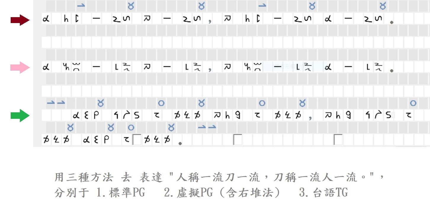 在 下圖裡,棕紅色箭頭指向標準的 双疋格式 去 表達 "人稱一流刀一流、刀稱一流人一流"。該標準A.1格式雖乃 又工整、又好寫 卻 不見得容易被初學者迅速地解讀。相對地,在 下圖裡,粉紅色的 箭頭指到另一群字體 於其 用了一種 '右堆' 技巧為代價 去 讓解讀幾乎如同面對楷體一般直接 且 無須經過轉調過程。這種右堆技巧就是一種折衷手段,它允許 右碼被上下堆疊 于 兩單筆,但 同時保持著一種虛擬的 PG格式 (允許一初調字多用一個單筆碼,但 寬度要維持兩碼寬)。這種折衷 介乎 標準雙疋 和 楷體的 手段,屬於一種 '調控的 拼筆字體' 在 "双拼轉調法" 一書裡。這類 虛擬PG手法,如 下圖粉紅箭頭所指,很適合教學板書 和 說明,經常能讓人們做到 '講到哪寫到哪',且 不需要聽眾們事先地受過額外的 訓練,只要他們認得楷體即可。這確保了極佳的 溝通體驗,也可作為一種暖身訓練 在早於 學習正式的 双拼轉調法前。