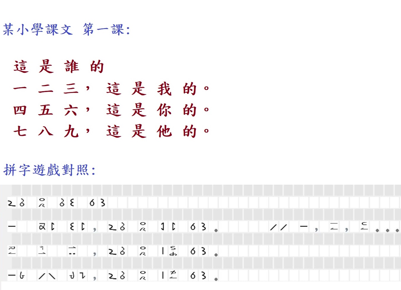 比如 在 上圖裡,只要 學生們看久了課文就會發現 "這是誰的、是我的、是你的、是他的"這一撂文字片段被對照 到 一眾新拼法 於其 顯然更容易被書寫,他們就會自然而然地使用那些符號,並同時地記住哪個符號對應到"言",哪個符號對應到"隹"等等。老師們完全不須要逼他們。