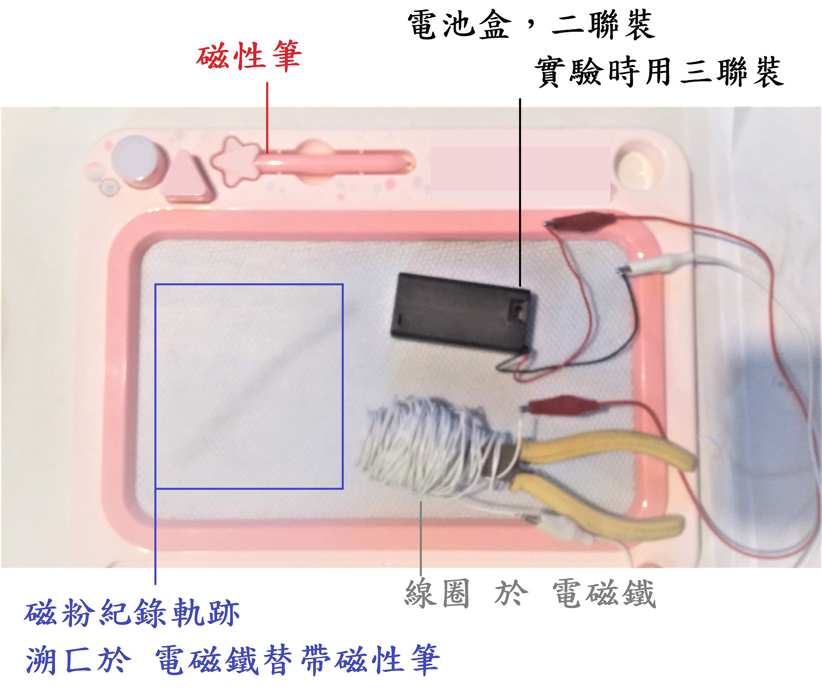 上圖的 實驗二展示了一種電磁鐵應用,即用一般電池 去 驅動接近安培級的 電流給線圈 而 產生磁場 去 吸起鐵粉 腑內於 玩具手寫板。