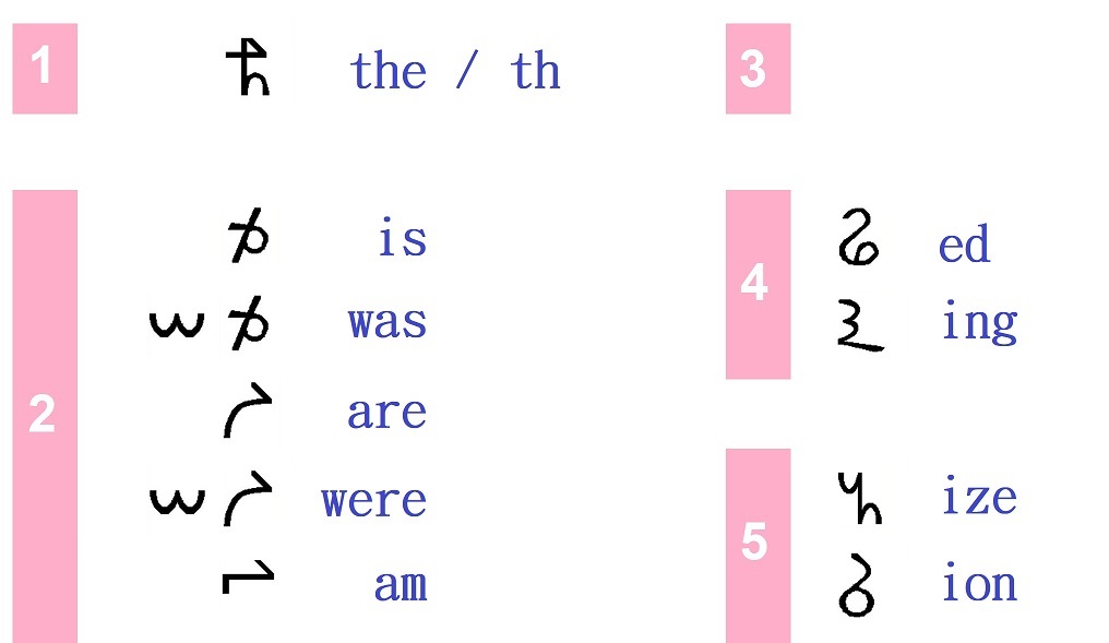 比如,咱若 先定義如下的 化名替代表,則 表示很多常用字料 或 字頭尾料能被簡化 且 同時幫助遊戲、打字、和 手寫: