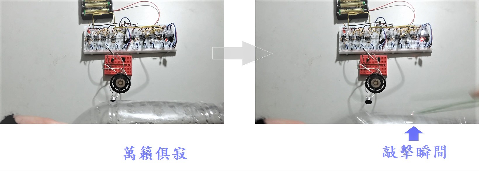 下圖的 實驗展示了聲控觸發級收到了鼓聲 來自於 鑷子敲擊空寶特瓶;然後,該觸發級暫時地點亮了紅白燈。