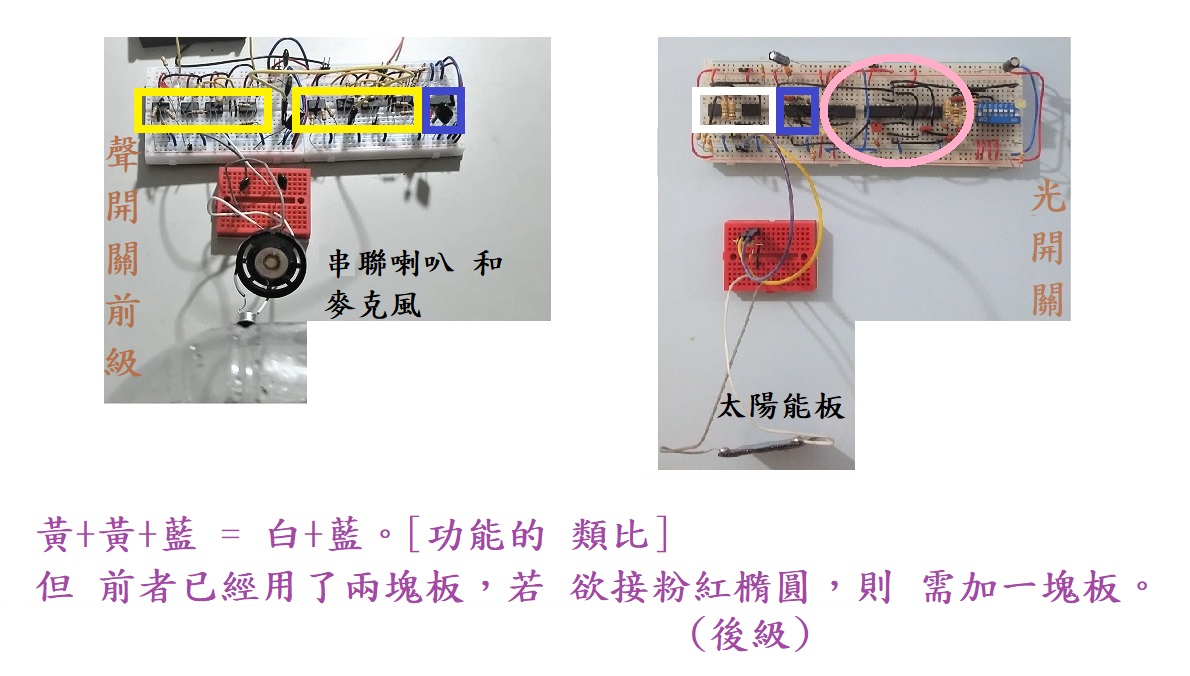 比如, 上圖的 電路被陳列到 下圖的 左側 去 對照右側的 聲控開關。其中,白框內部的 電路處理放大功能乃 相當於 晢其功能 在 左側的 一個黃框內。該一個黃框內有四個IC、而 該白框內只有兩個IC。這是因為白框內有個IC整合了三個IC的功能,所以它的 價格比較昂貴。這種高度的 整合,除了能節省面積,還能降低噪聲入侵。