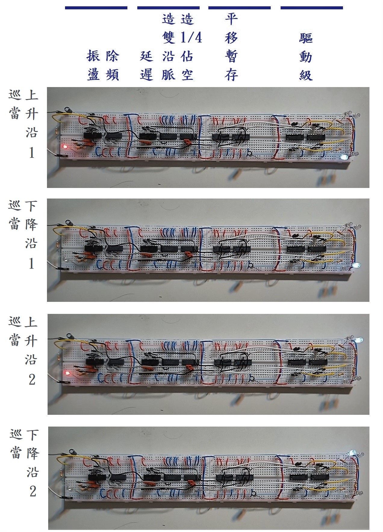 其中,四個LED分別反映四個輸出Q0、Q1、Q2、Q3,依序由左到右 予 該計數器。