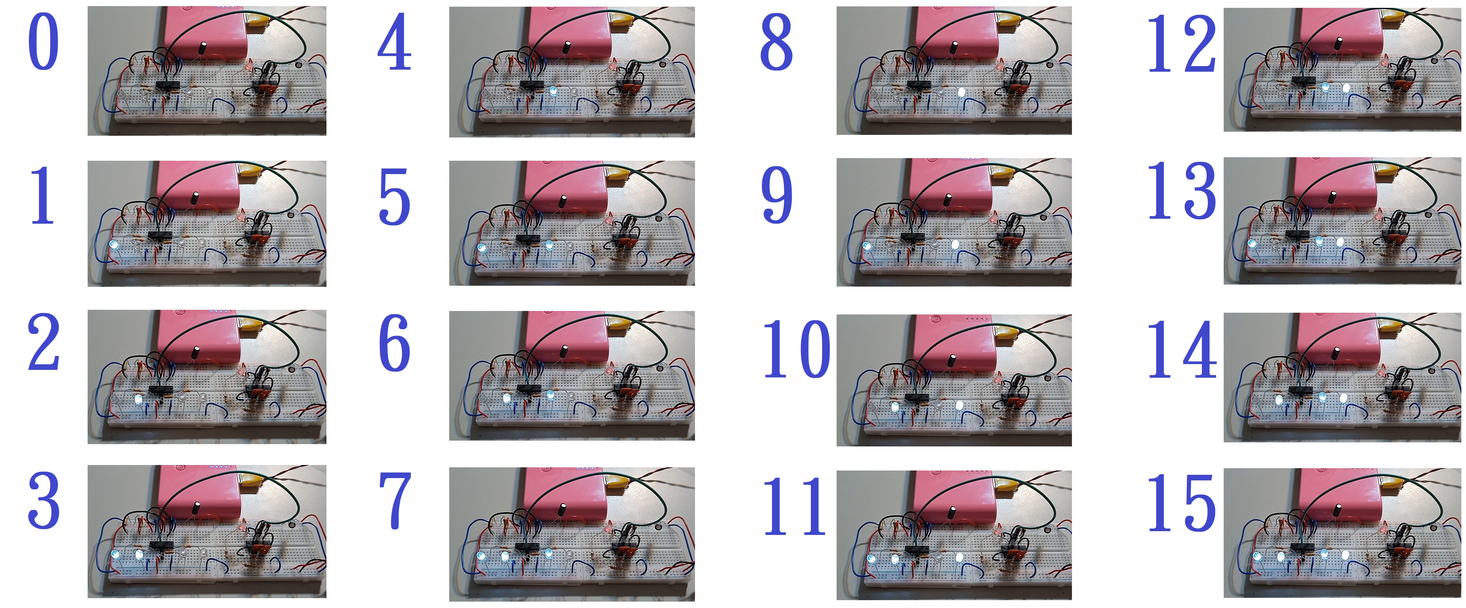 即是說,計數器受驅 於 振盪器時,將依序呈現 0、1、2、...直到 15,然後 又返回0 且 周而復始 於 二進位的 計數器輸出格式。