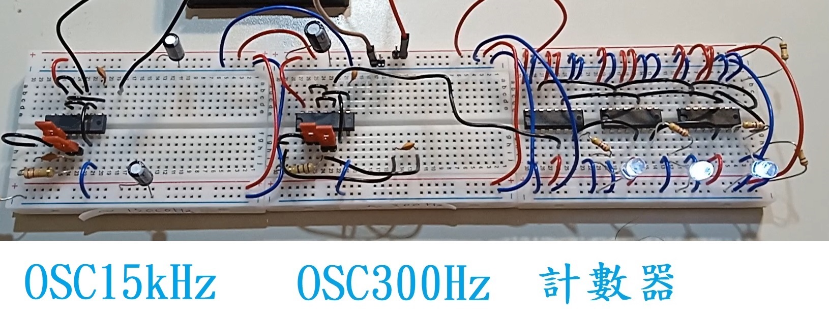 當 計數器受驅 於 OSC300Hz 時,三個LED的 閃爍都能被察覺,因為它們有頻率分別接近18.8Hz、1.2Hz、和0.07Hz。