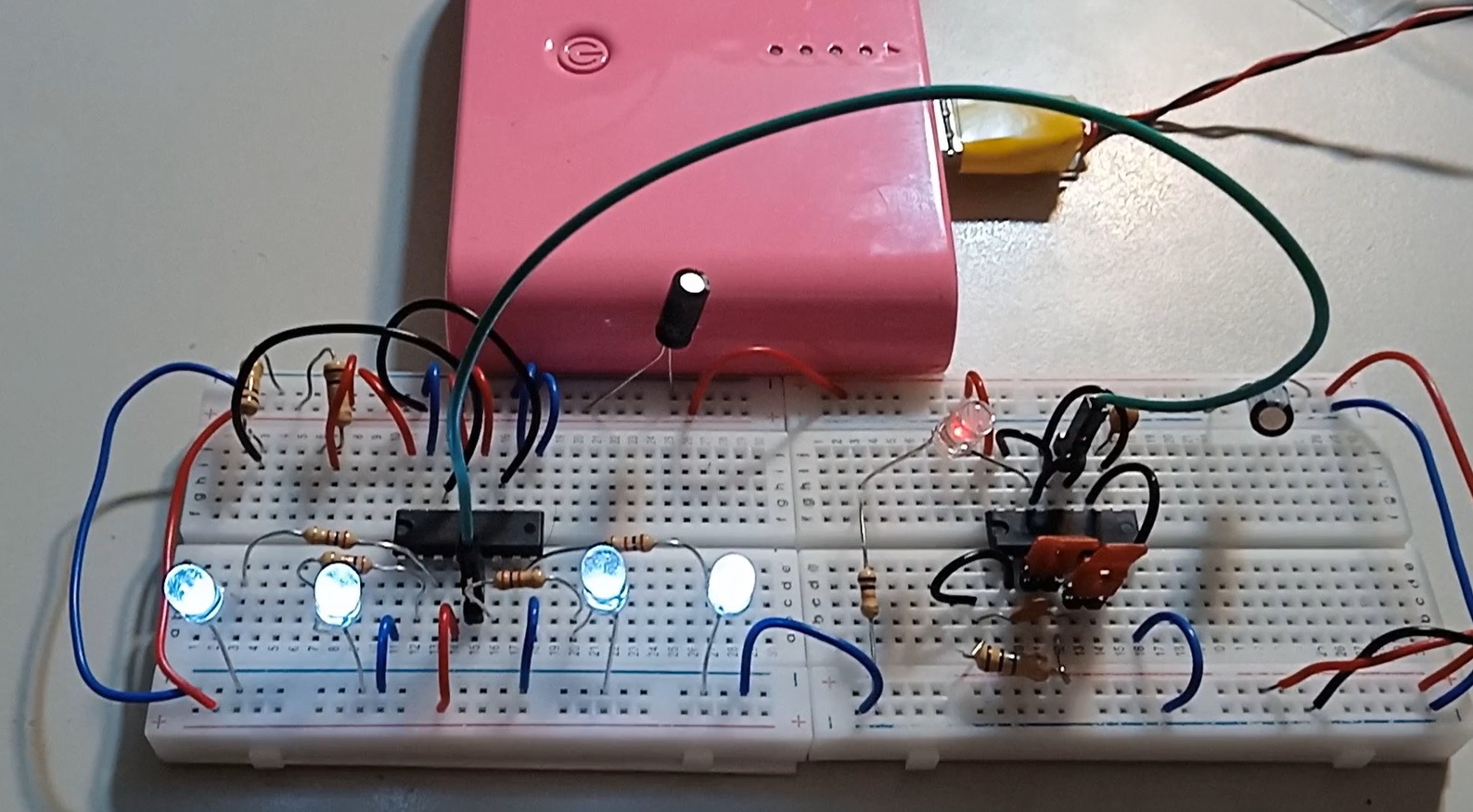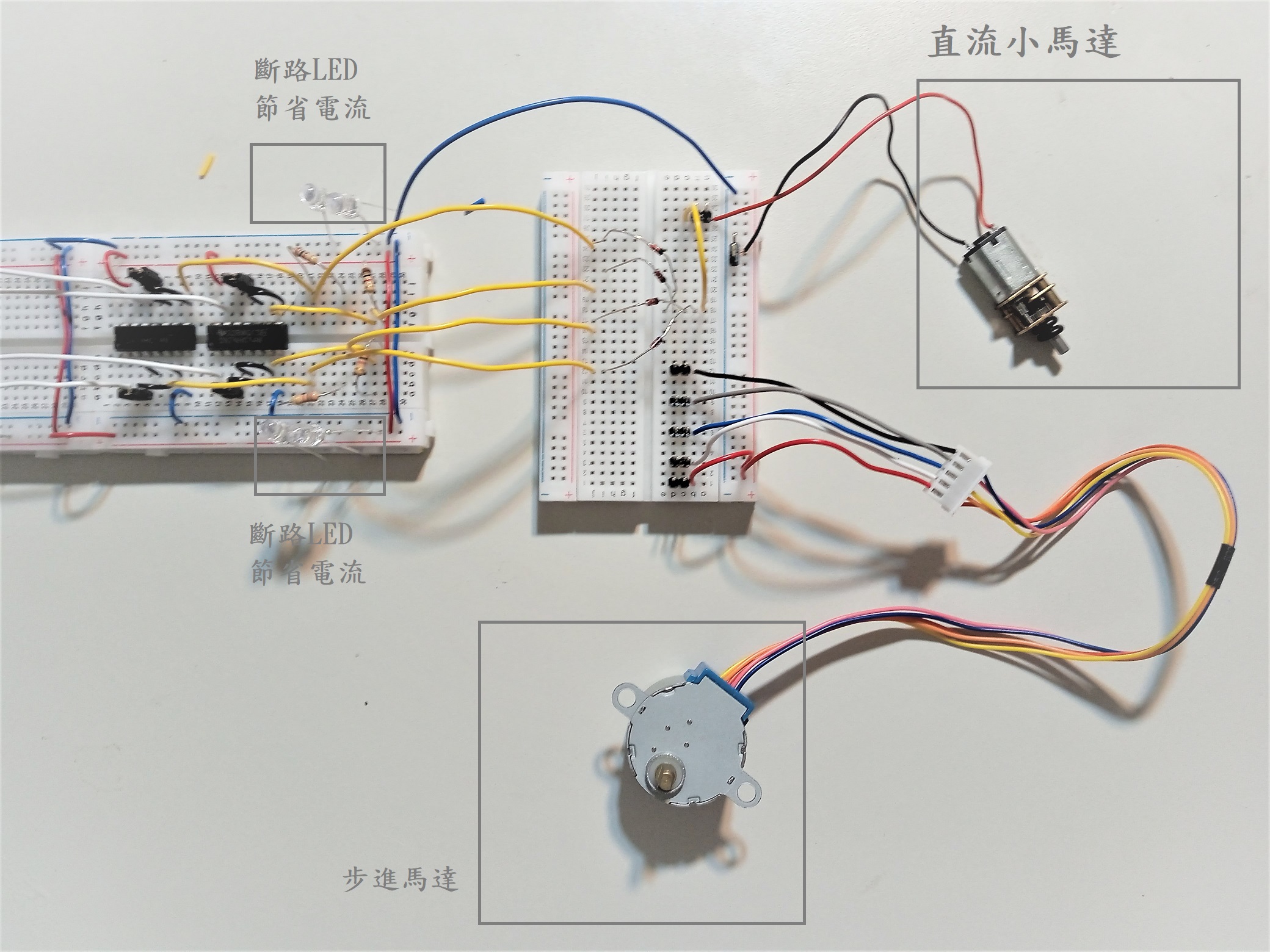 上圖左半邊的 麵包板搭載著一個計數器,其初次被展示 在 電源區 於 2023/0822。