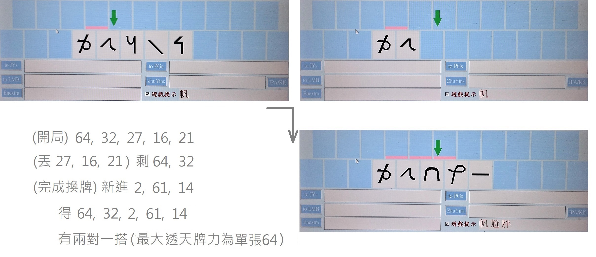 小明想保留最大牌號65不被更換,以防萬一最後對手有同樣的 對子數 去 造成比拚透天牌的 局面。