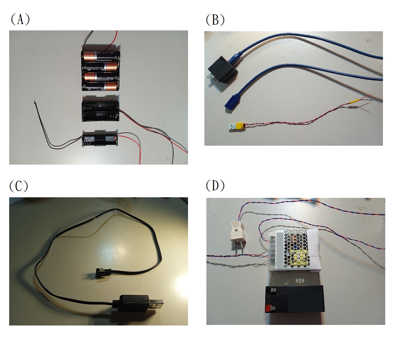 圖(C)有關 於 市售的USB轉特殊電壓充電器;圖(D)有關於 12V的 充電器 搭 手焊插頭、單心線輸出入鎖定 或 12V電池。