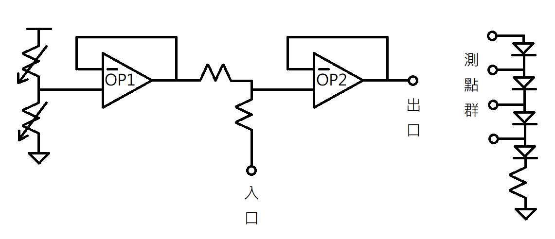 用一外接定電壓源、LED、定電阻、可變電阻、和兩個OP去測量輸入電壓。