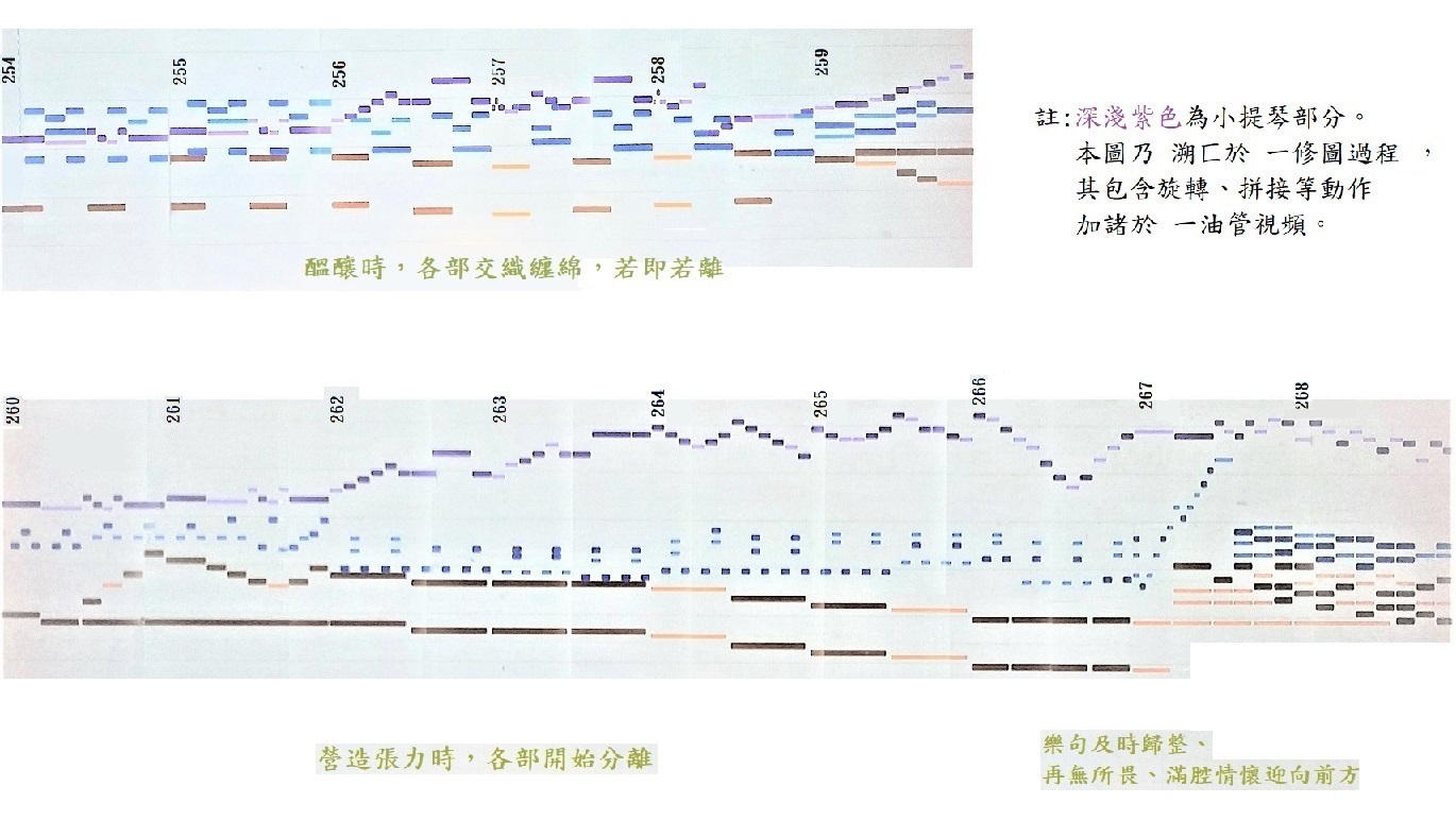 這種格式就很像聲譜圖,時間軸也是線性的。相較之下,小提琴的 五線譜受到頁面空間限制,高音部分常需要高音記號。其中,紫色主要旋律 在 #254-257小節是 雷同於 其在 #260-263小節。它們分別自身確實如前所述 也都 有模進的 味道。