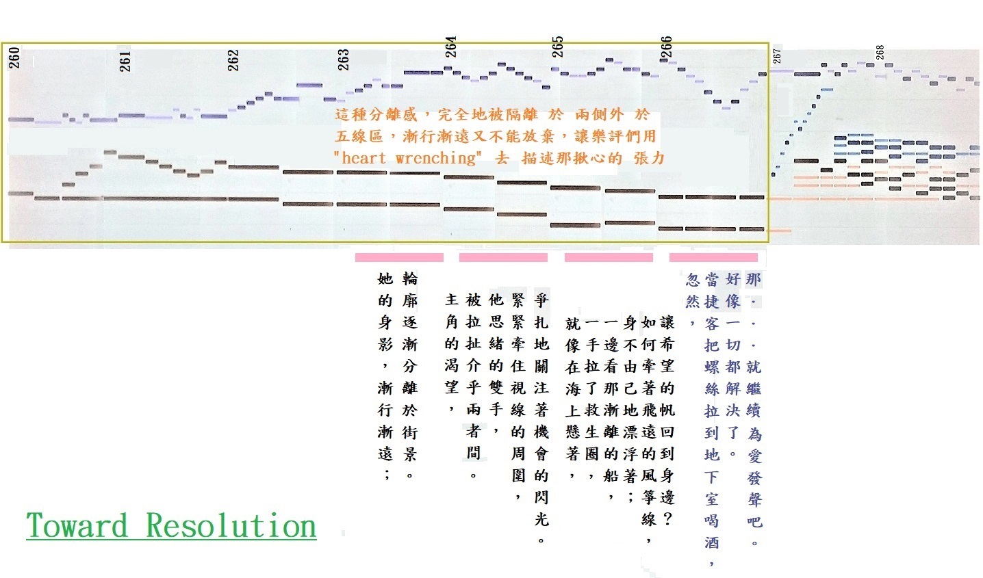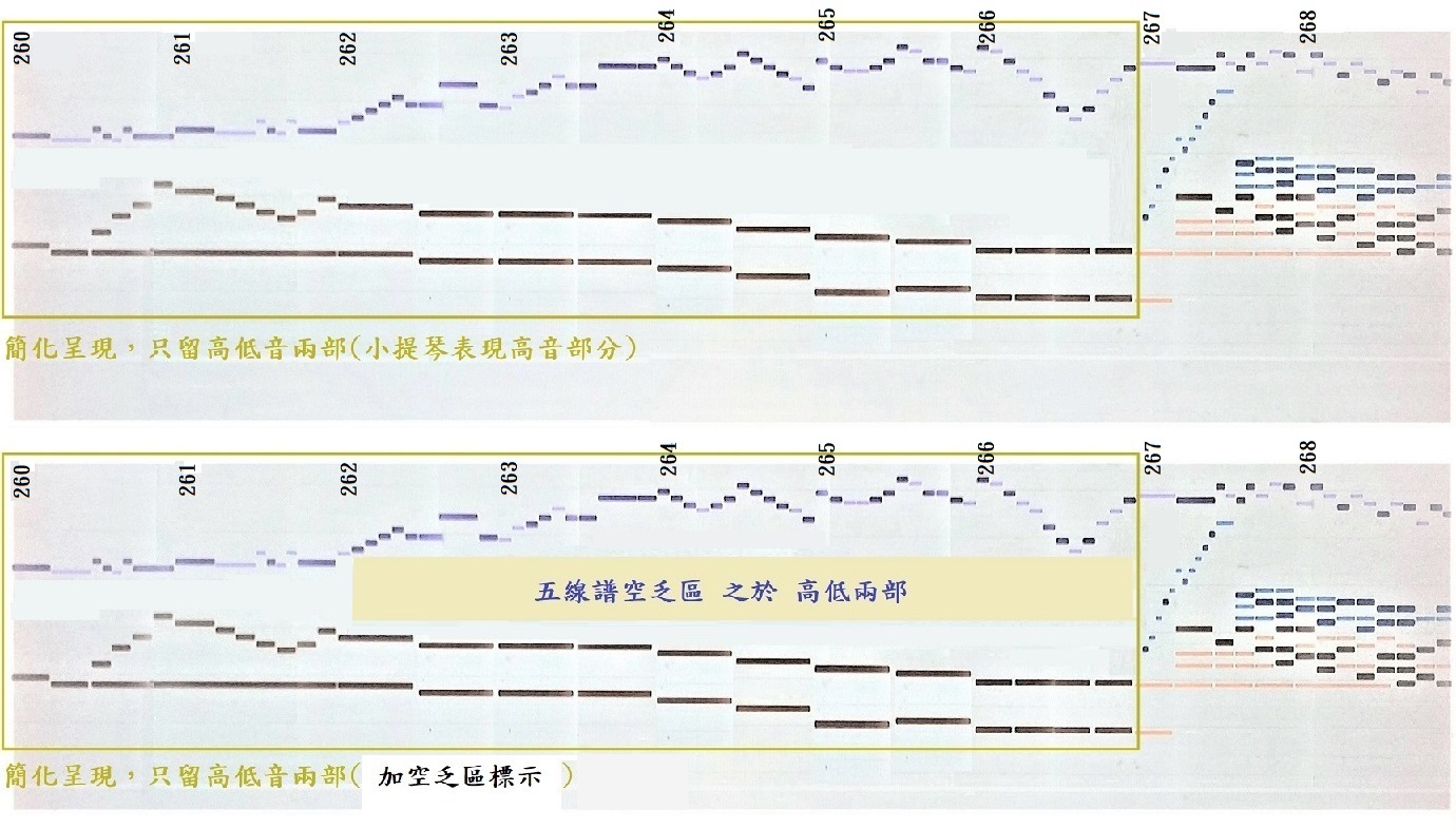 上圖也呈現小節 #260-268,但 去掉了中間部,只留下高低兩部 在 黃框內。其中高音部分為小提琴,低音部分為背景。若 加上一個鵝黃色的 長方形,如上圖下方所示,則 讀者就能看到五線譜的相對位置。
