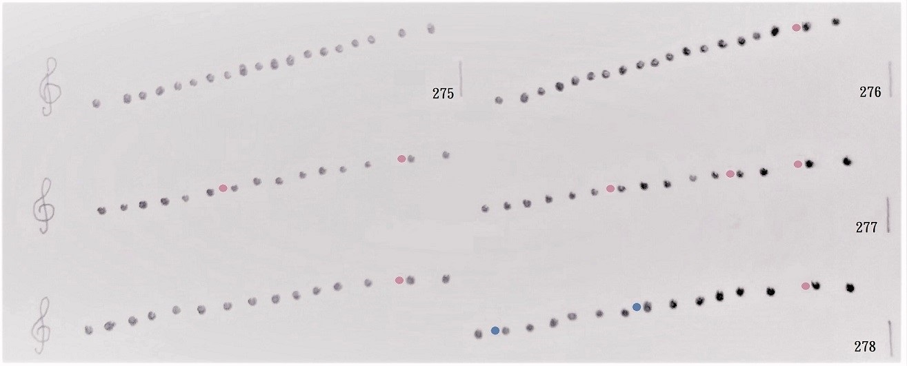 上圖的 黑點是蓋印圖跡 伴搭 透光複寫的 抄譜方式,只留豆子,不留芽菜。粉紅圓圈代表升記號,藍色圓圈代表降記號。