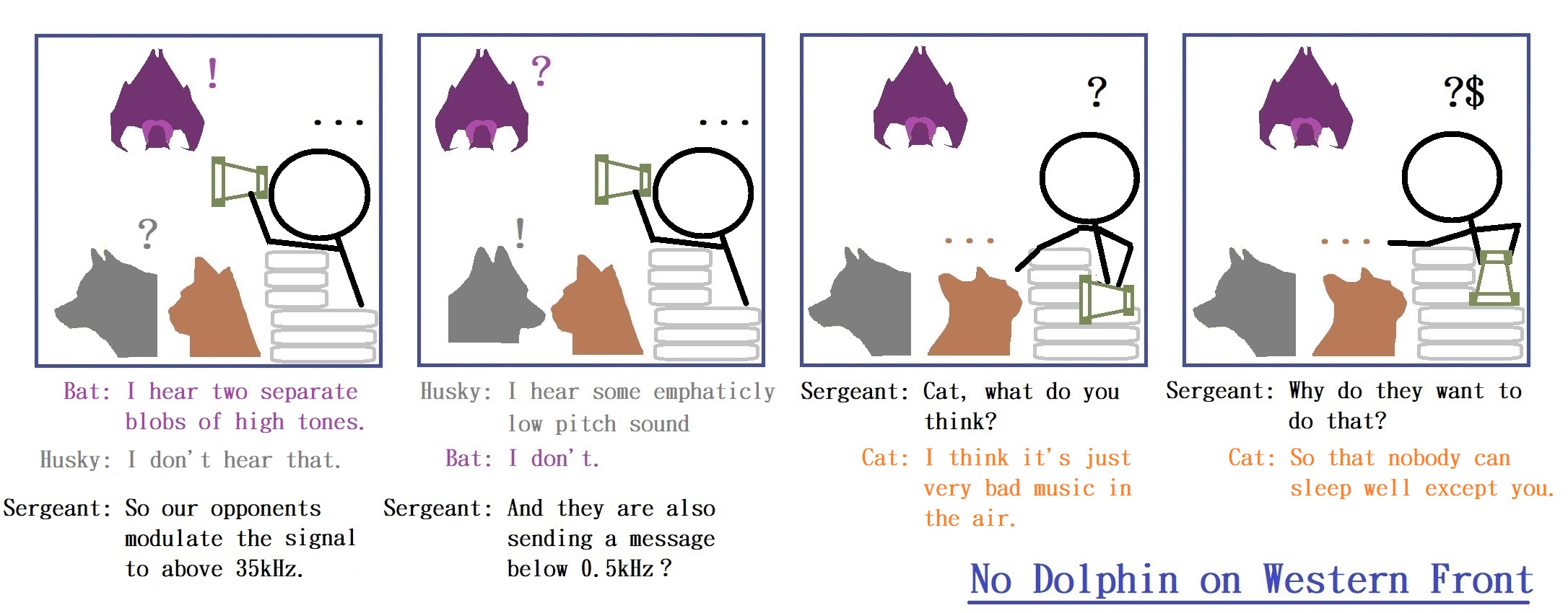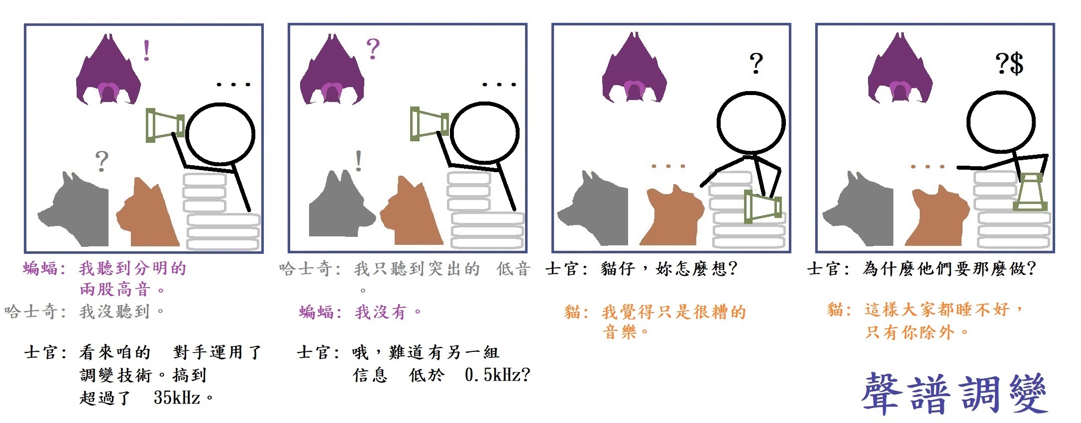 作者這麼畫,是 肇因於 聽說蝙蝠能聽極高頻、但 聽不到甚低頻,且 聽說犬類能既能聽低頻也能上聽到35kHz以內。