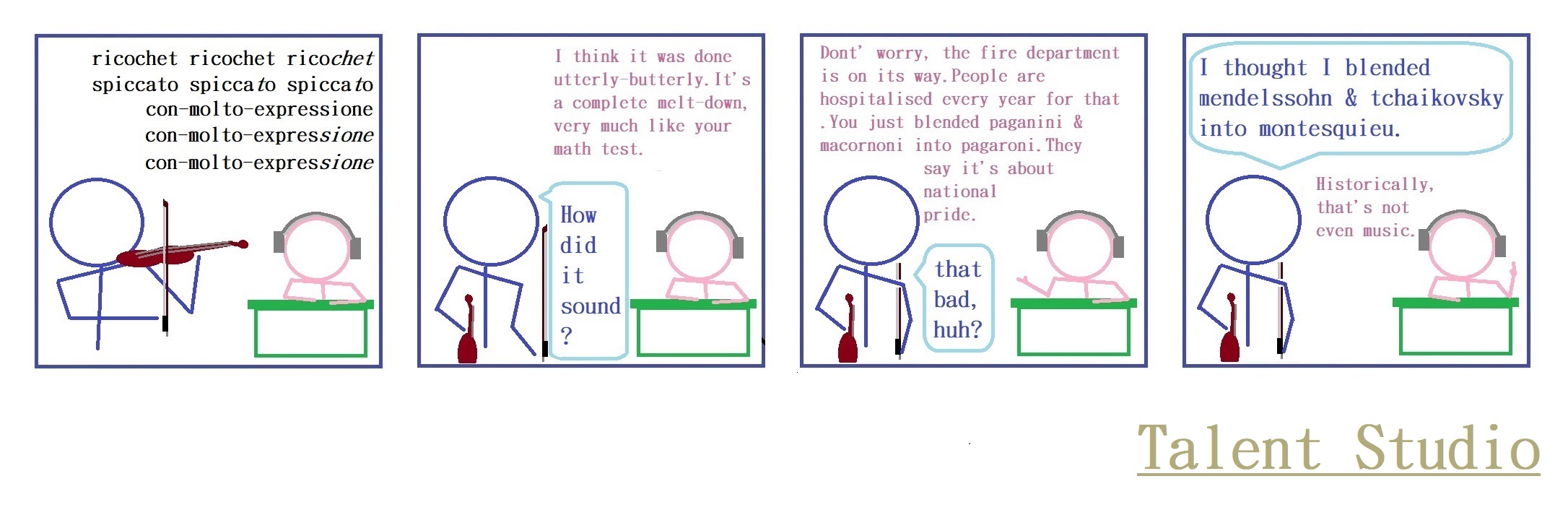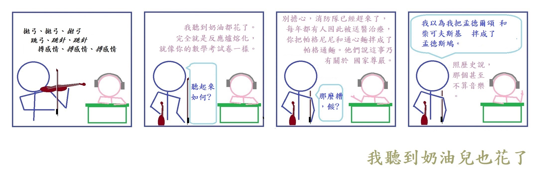 這裡的 漫畫想借用小提琴 去 介紹一種連續雙關延伸的 台詞創作法,其頗為有用 於 描述晢觀感 在 聲音這種經常不帶畫面的 物理現象。