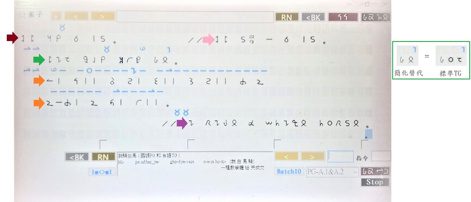 比如 下圖的 棕色箭頭 指向標準A.1的 表音法 "我祁白傌" 給 "我騎白馬" 這話;後面的 双斜線註釋處,即粉紅箭頭處,則 顯示 "我騎一白傌",表示 "我騎一白馬"。即是說,咱的 軟體可以讓騎字用左半邊的 8號單筆 搭 右半邊的 堆疊 于 63號單筆 和 56號單筆 去 直接三拼成字。該種三拼雖然非真的 雙碼格式,但 仍然保留了双格規範。未來咱會細講什麼時機適合用這種堆字方式,其不只適合 於 註釋,且 可搭配結尾變形概念 去 擇機為之。