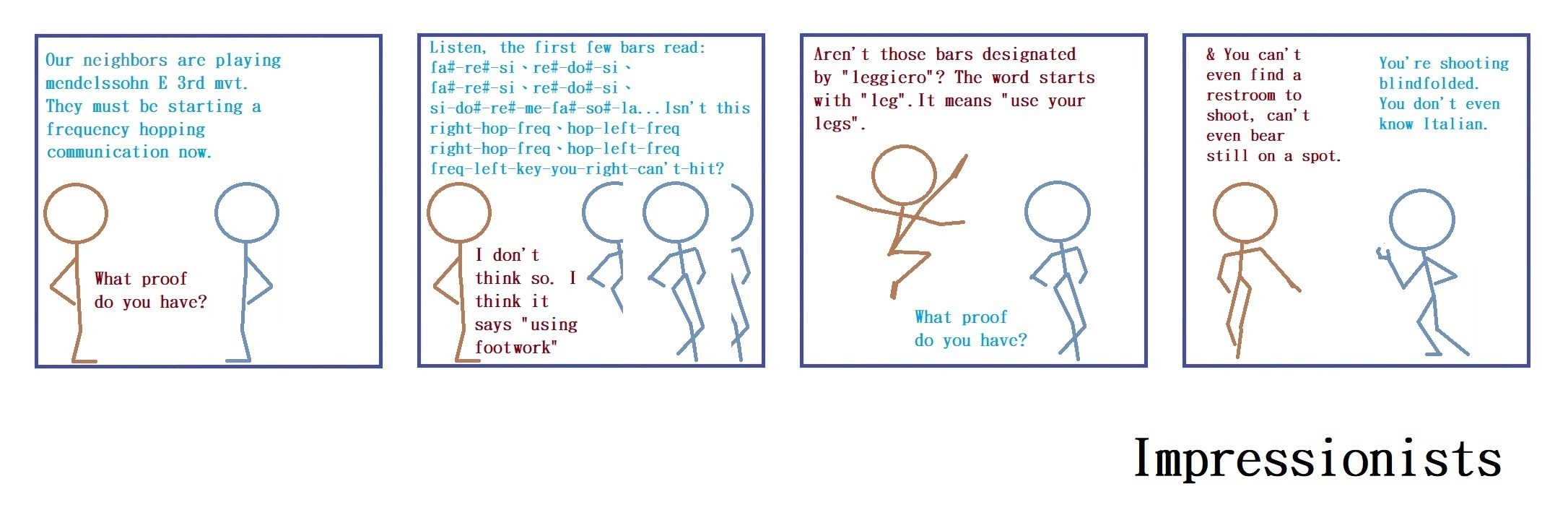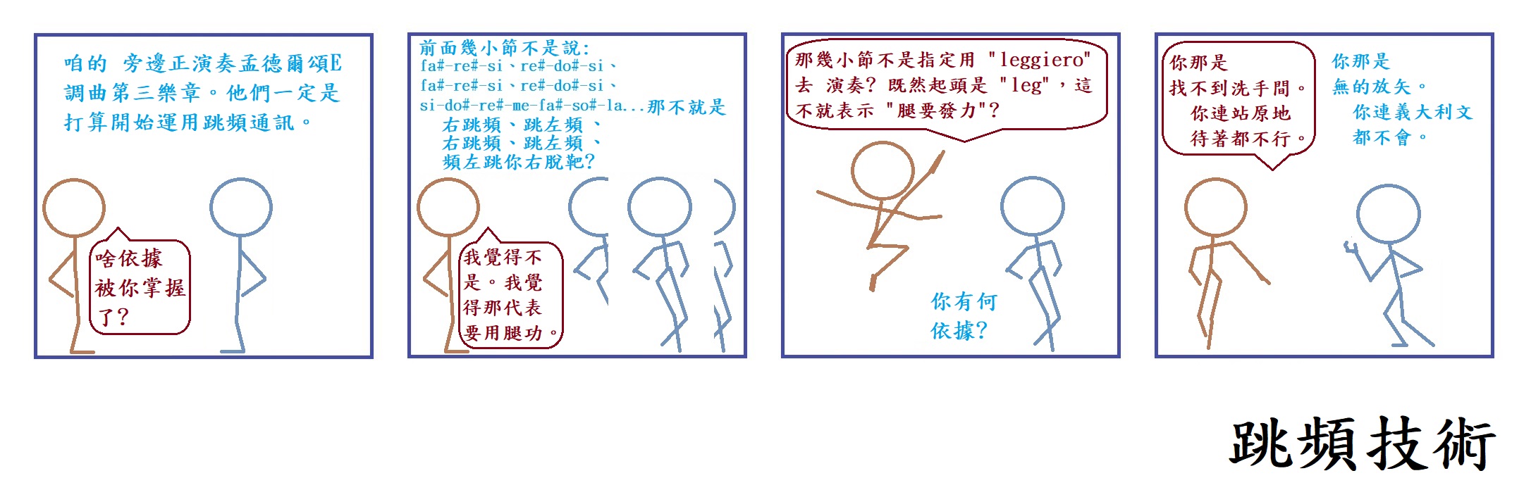 在 上頭的 漫畫裡,leggiero 被一般讀譜者理解 成 "輕快的"。在 原樂譜裡,它 被標示給一些音符料 於其 快速地往返 於 小距離間隔,而 營造了一種 相對不那麼嚴肅的 感覺。