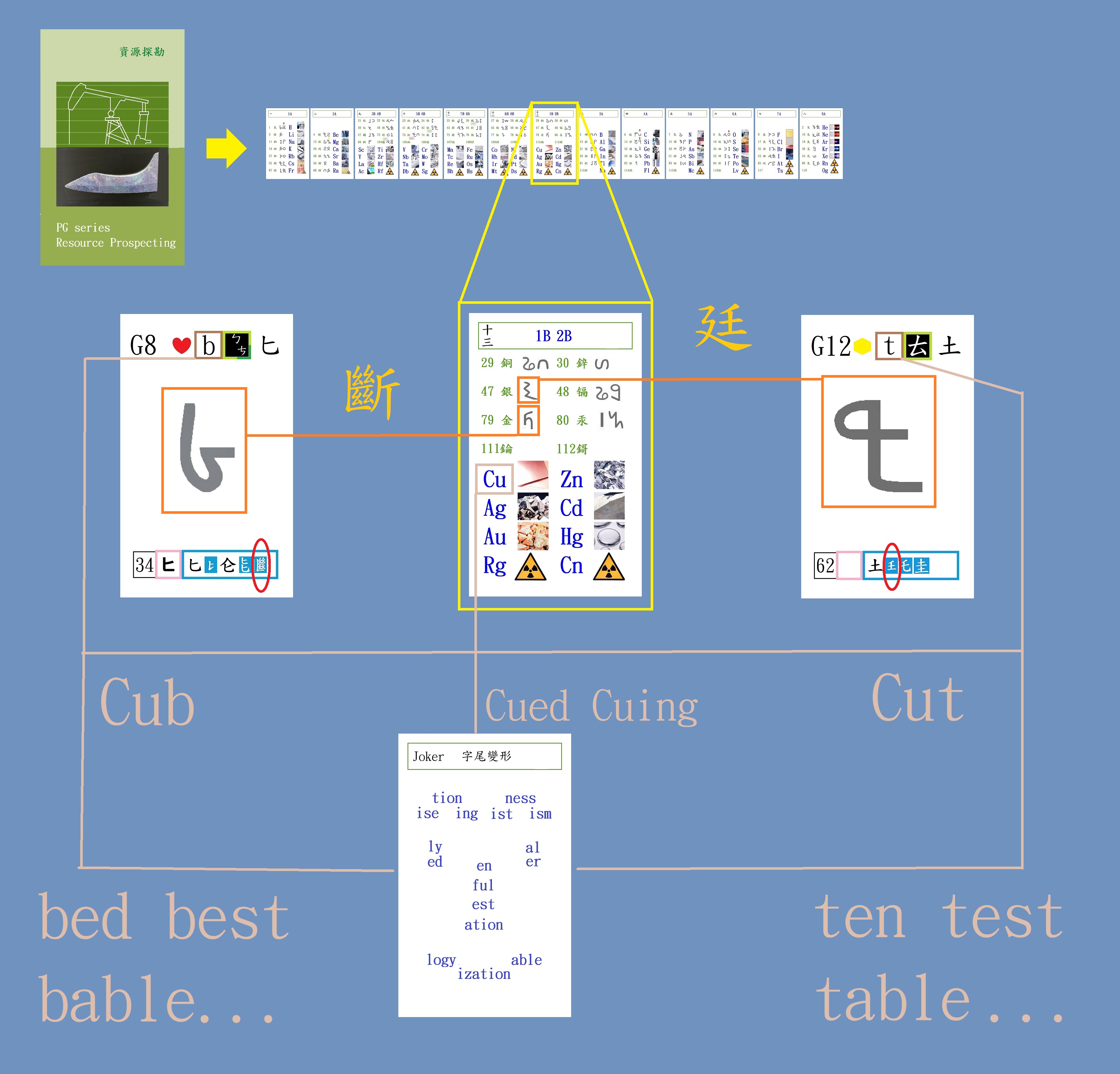 不只如此,該牌裡的 Cu搭34號撲克的 b,可双拼出英文字 "Cub";若搭62號撲克的 "t",則可双拼出英文字 "Cut"。