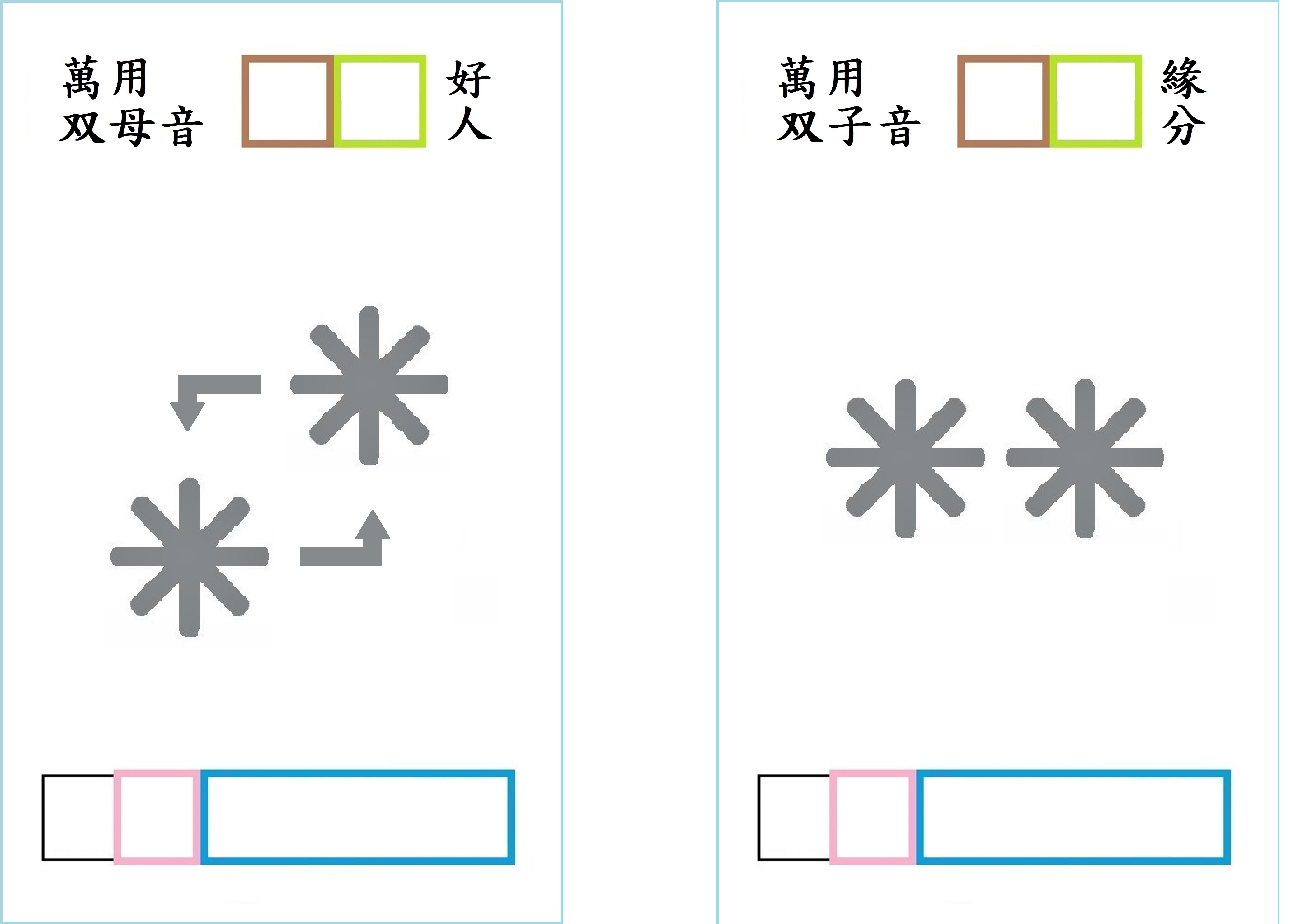 如此左邊那張代表ow 或 其它双母音、右邊那張代表fl 或其它双子音如 st、pl、sk、cr等等,就能把flower的 音縮減到三張牌。